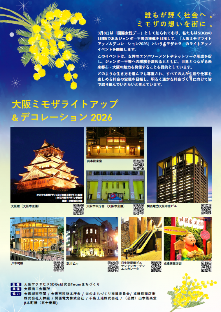 - 大阪城天守閣、大阪市役所本庁舎、大阪ひかりのまちづくり協議会、戎橋筋商店街、株式会社大林組、関西電力株式会社、千島土地株式会社、(公財)山本能楽堂、β本町橋(50音順)