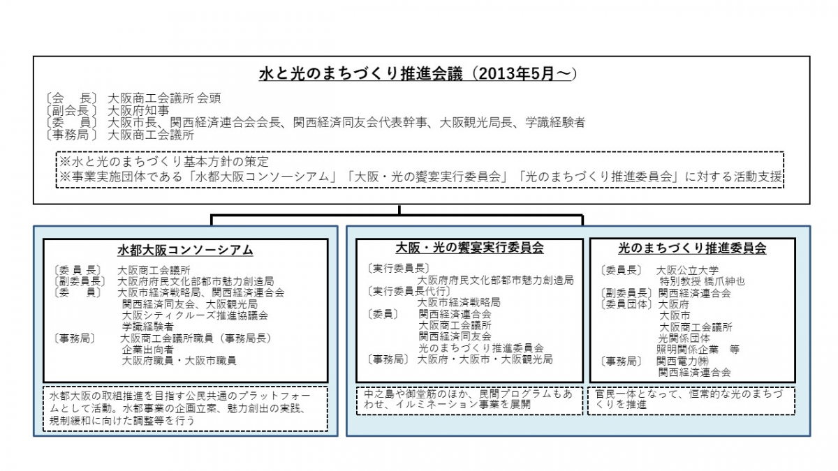 公民の強い連携のもと、水と光を活かした都市魅力創造の実現に向けて、水都大阪の持続可能な成長をめざす公民共通のプラットフォーム「水都大阪コンソーシアム」によるコーディネート機能や、「光のまちづくり推進委員会」による夜間景観の創出、「大阪・光の饗宴」の開催による魅力づくりなどを通じて、担い手としての企業やクリエイティブな人材などの多彩な「民」や学、地域、市民の参画・共創を促し、新たなビジネスの創出・活性化やまちづくり活動の促進を図る。